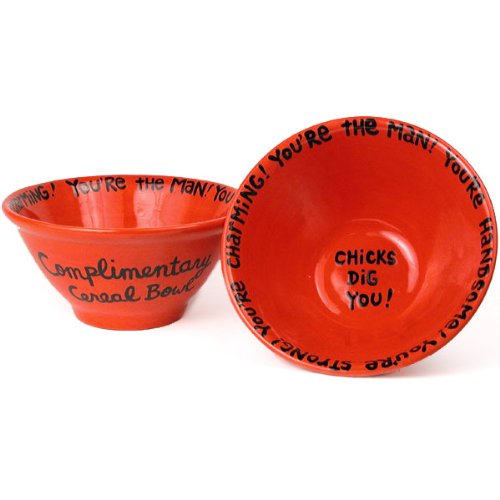 Get yourself pumped up with some daily affirmations with this line of bowls. Raise self-esteem and build confidence with the Chicks Dig You! bowl that reads You're the Man! You're Handsome! You're Strong! You're Charming! Each piece is individually hand-painted. Lead free, dishwasher, and microwave safe. Available in various colors. 32 oz., Ceramic.
