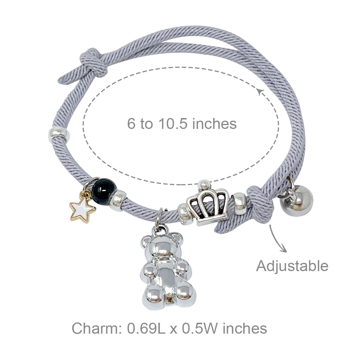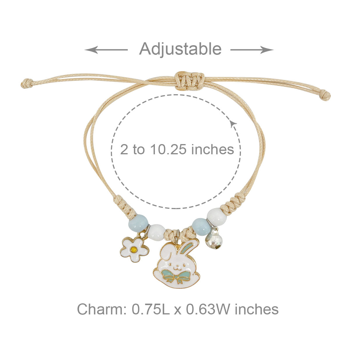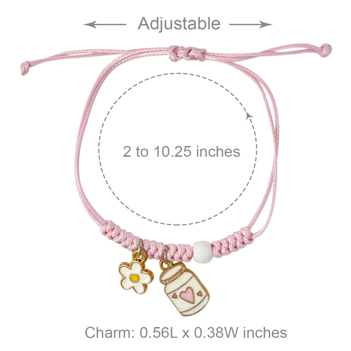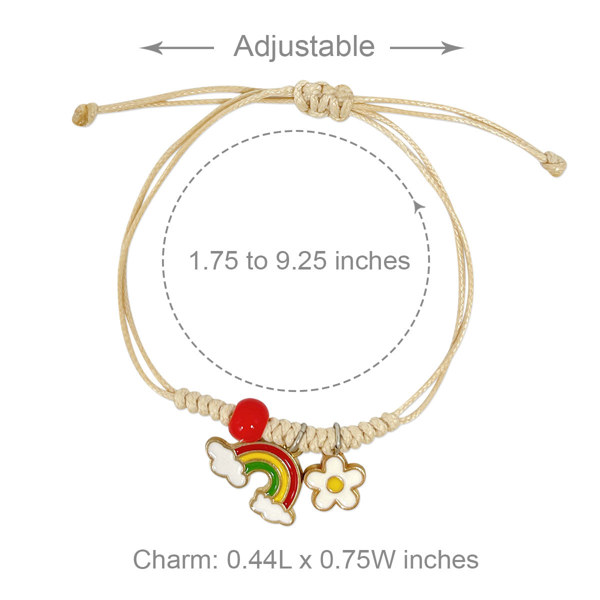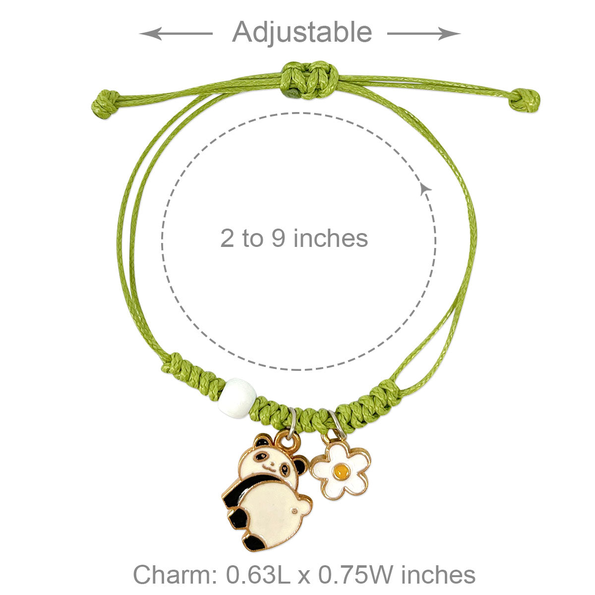- Adjustable bracelets: circumference adjustable from approximately 2 to 9.25 inches; charm size varies by design, ~0.5L x 0.75W inches; beads 0.19W inches.