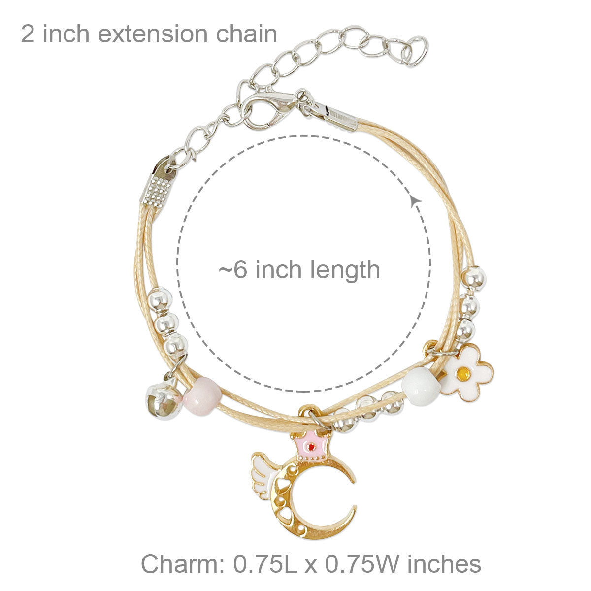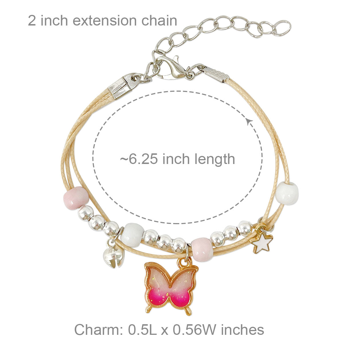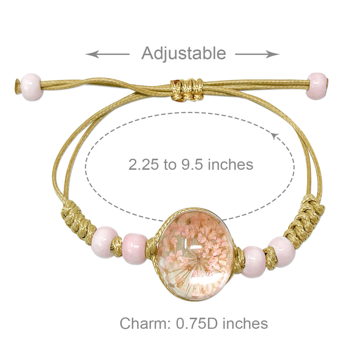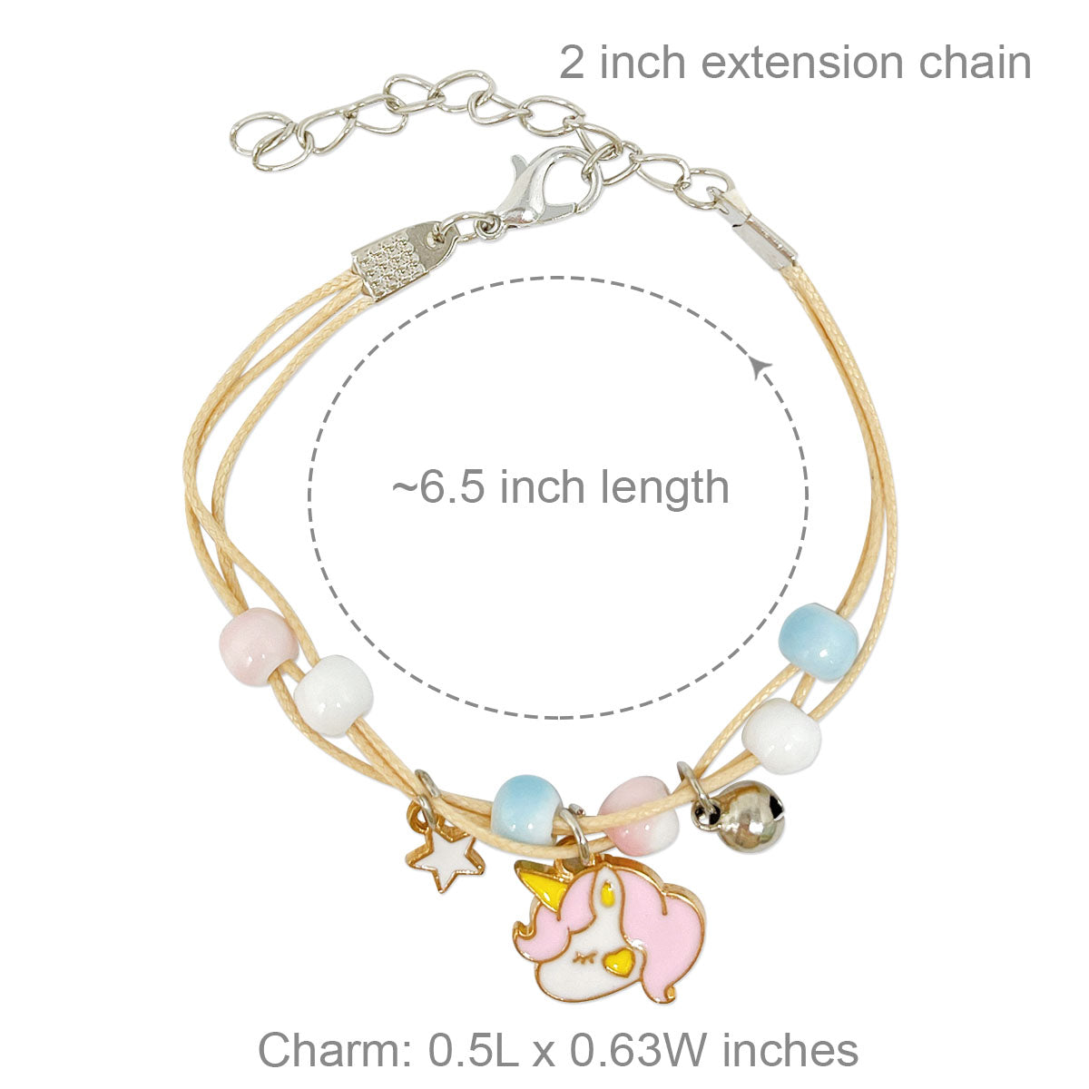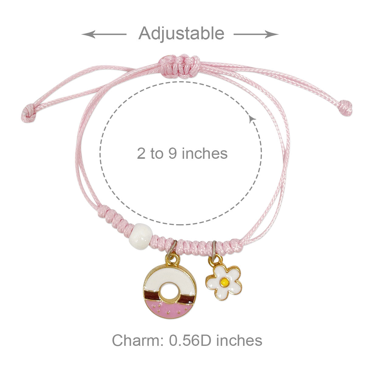 - Adjustable bracelets: circumference adjustable from approximately 2 to 9.25 inches; charm size varies by design, ~0.5L x 0.75W inches; beads 0.19W inches.