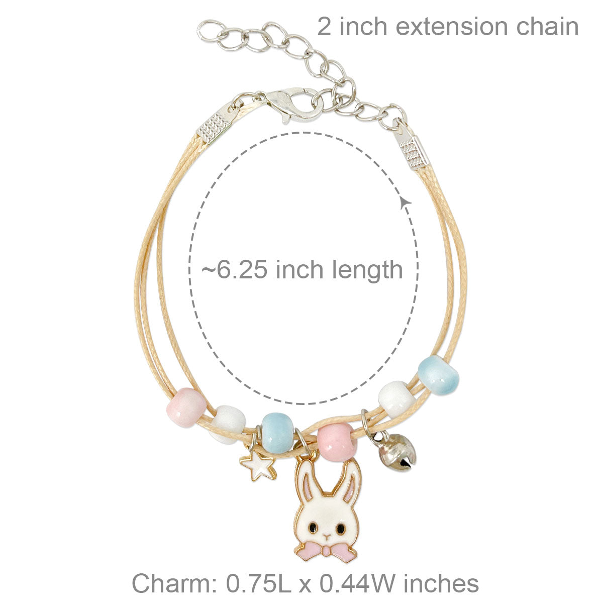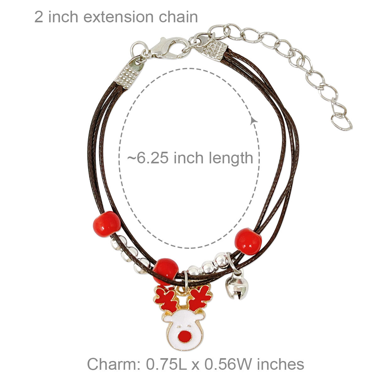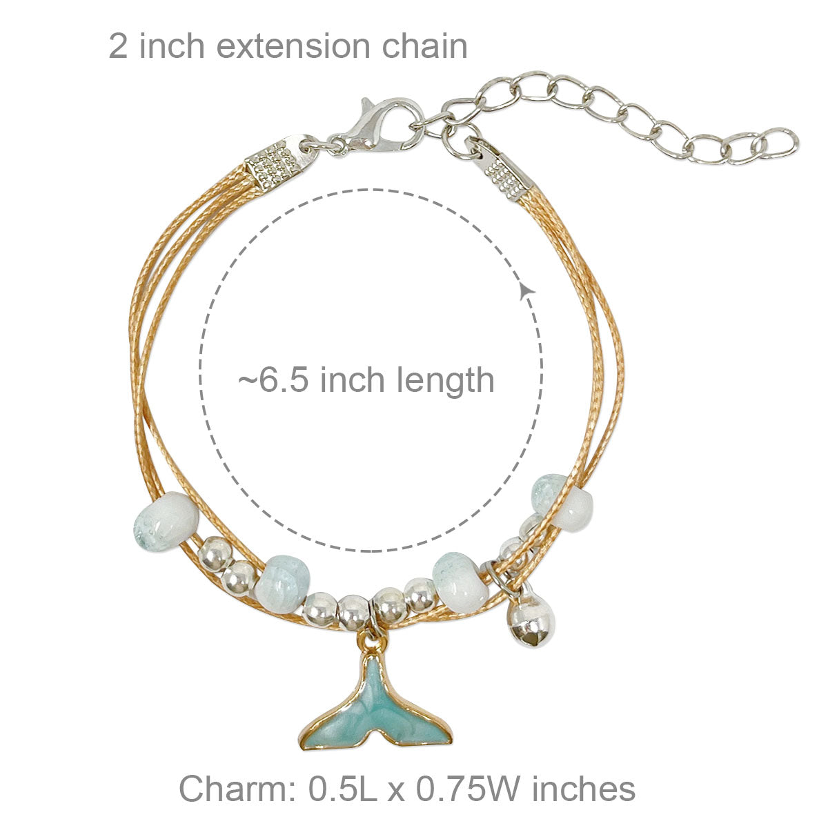 - Lobster clasp bracelets: ~6.25 inch length with 2 inch extension chain; charm size varies by design, ~0.5L x 0.75W inches; beads 0.19W inches.