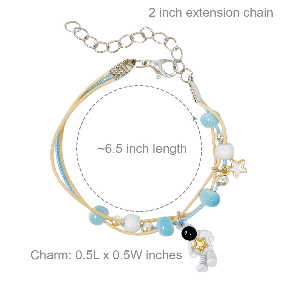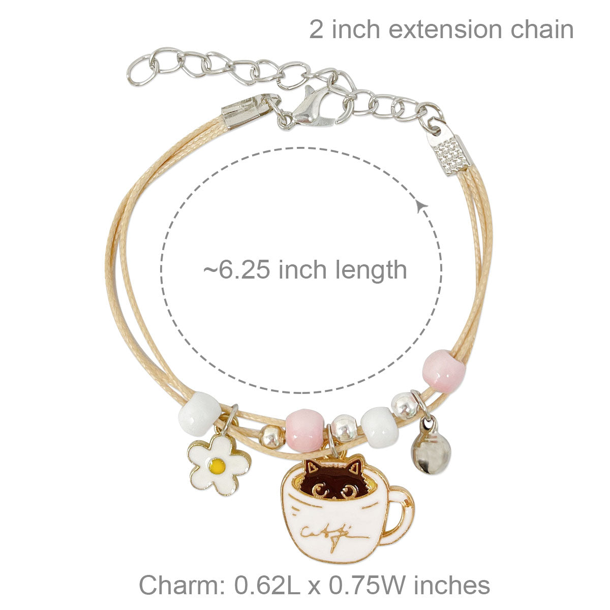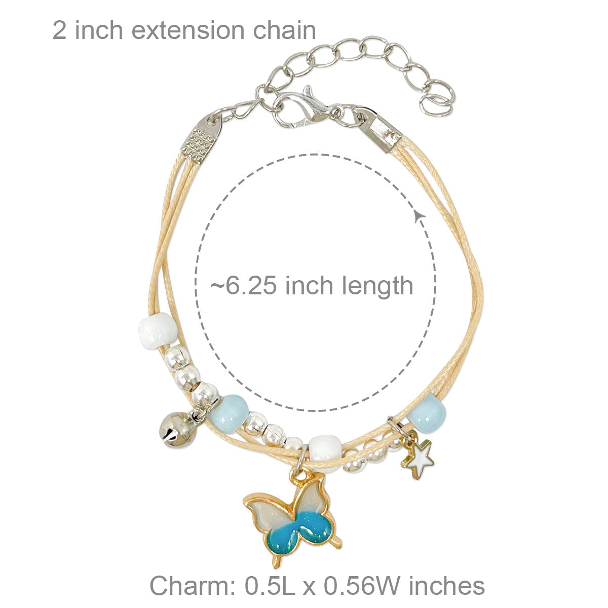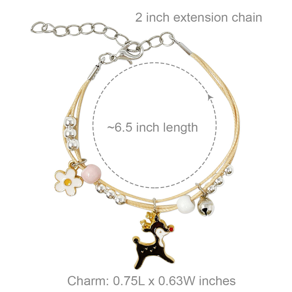 - Lobster clasp bracelets: ~6.25 inch length with 2 inch extension chain; charm size varies by design, ~0.5L x 0.75W inches; beads 0.19W inches.