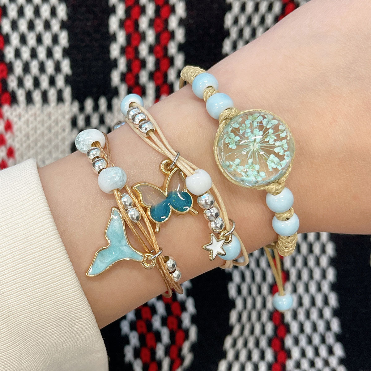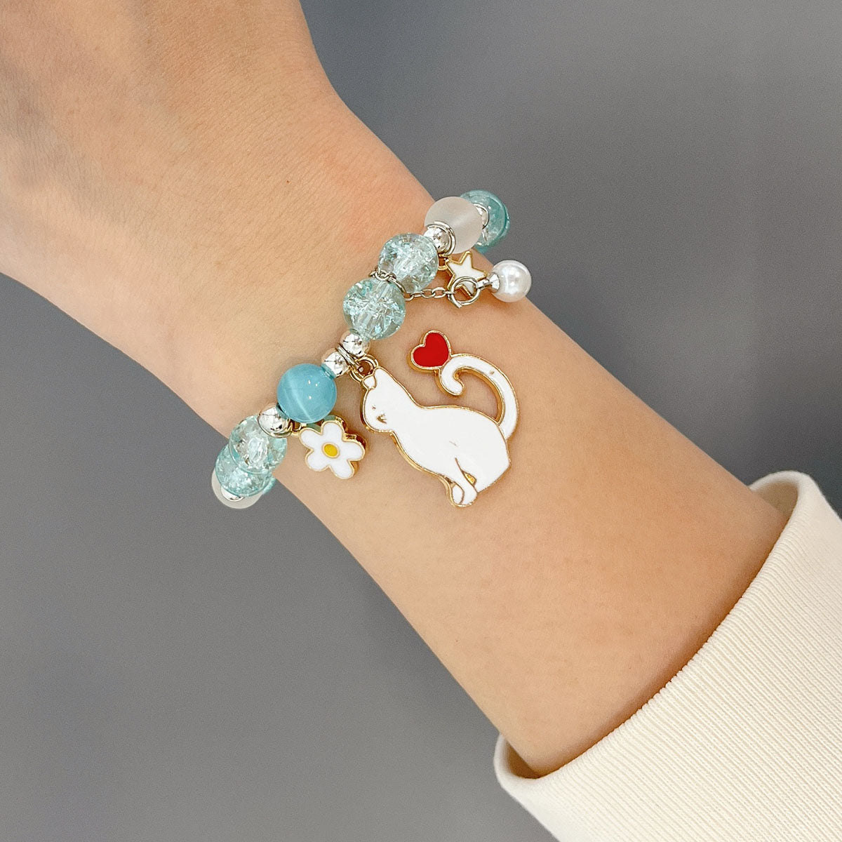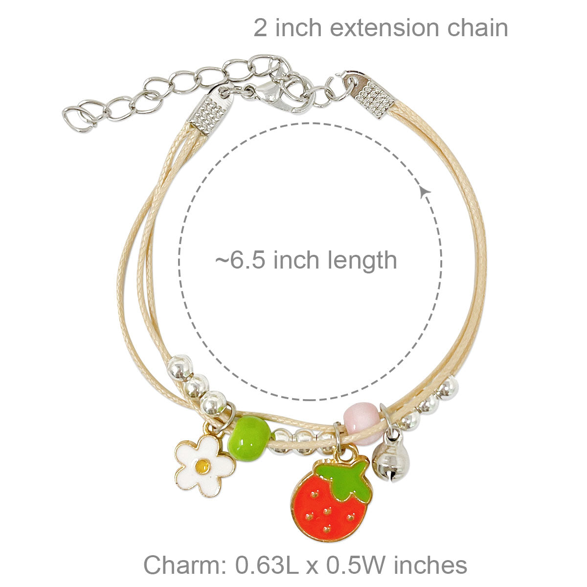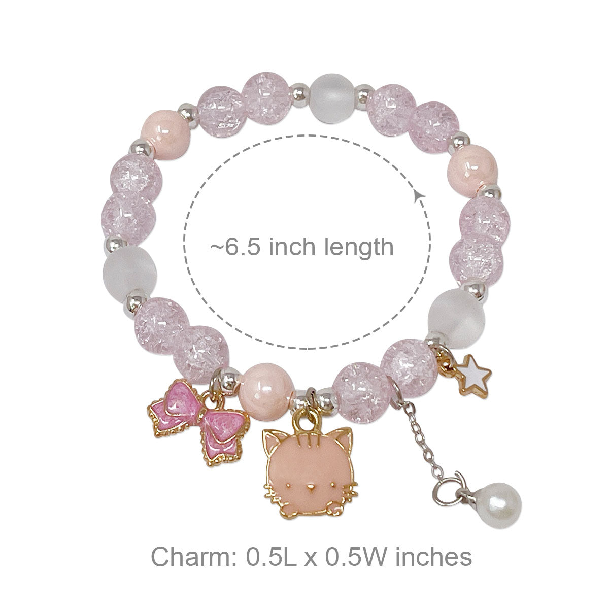 - Elastic bracelets: ~6.5 inch circumference; charm size varies by design, ~0.75L x 0.75W inches; beads 0.25W inches.