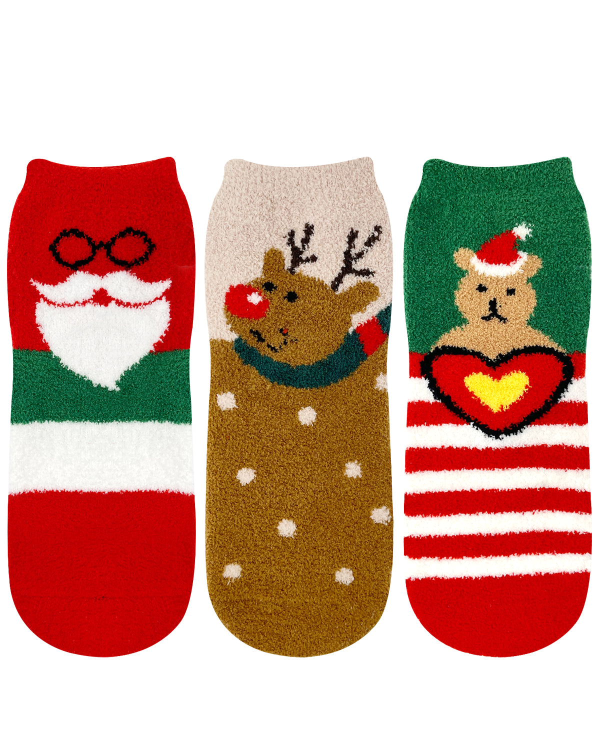 Get into the holiday spirit with our fun and colorful Christmas socks. Choose from Santa, reindeer, and more. The socks are soft and fuzzy feeling that will provide extra warmth during the cold winter months. Great for lounging or sleeping in, these socks are so comfortable, you will not want to take them off. Sold as a set of three, makes a great Christmas gift.