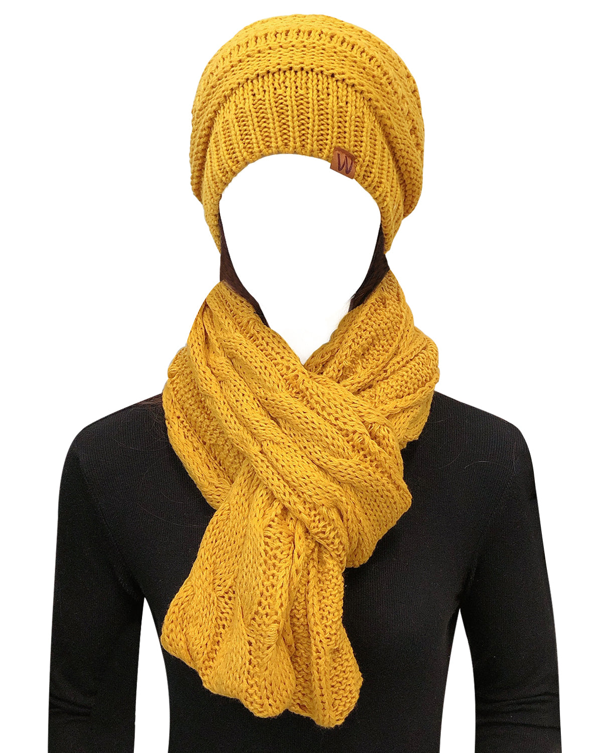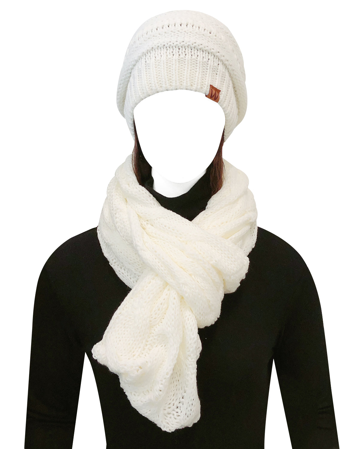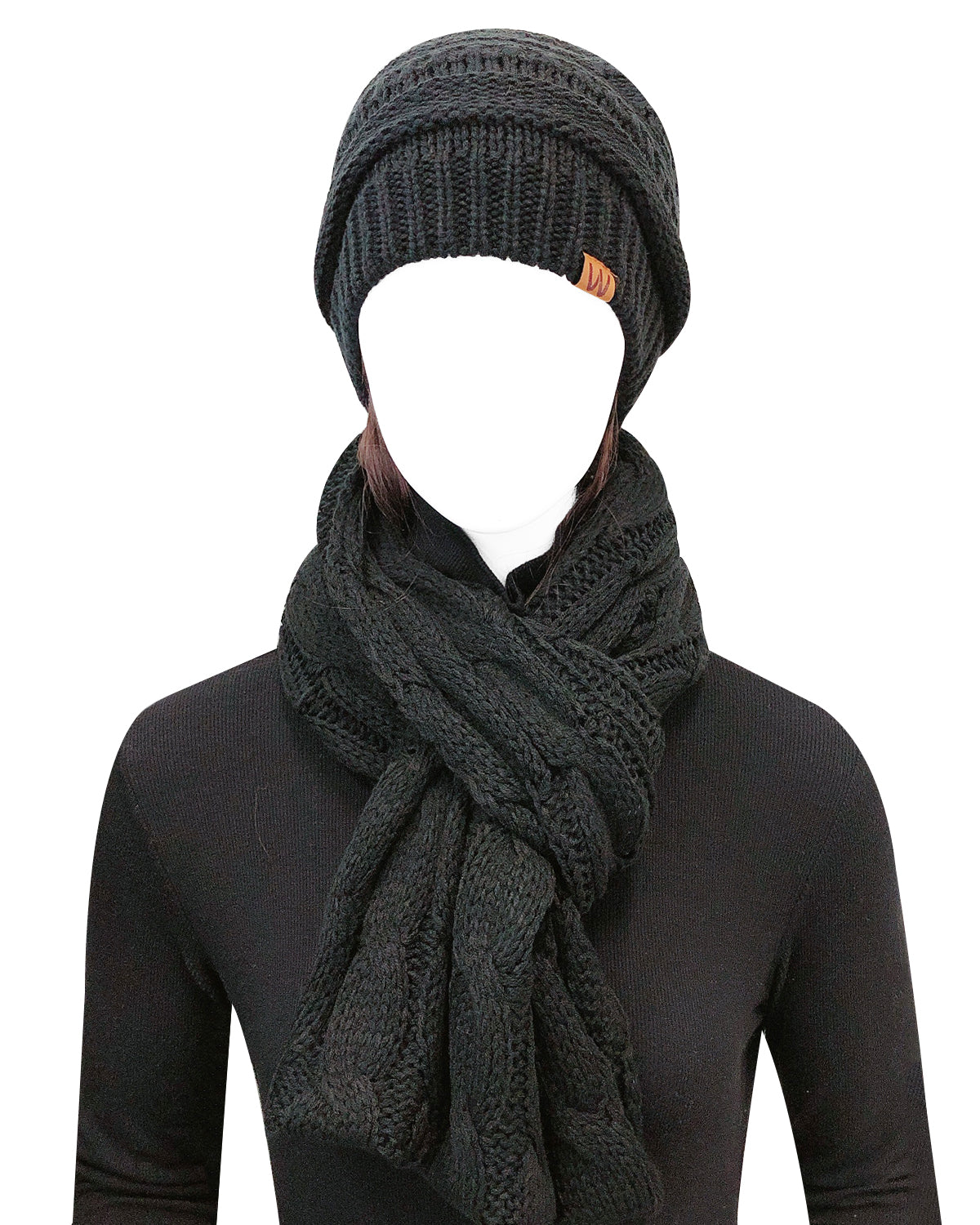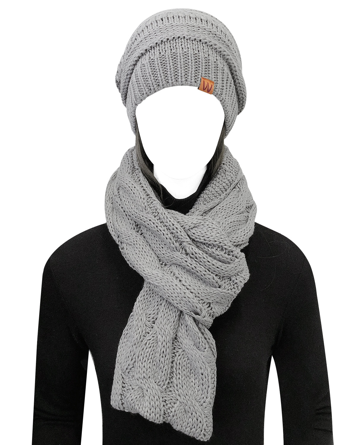 - Look stylish in this scarf and beanie set with its chunky knit design. Its thick knitting and super soft material provides perfect coverage over the head and ears, and neck against the cold elements.