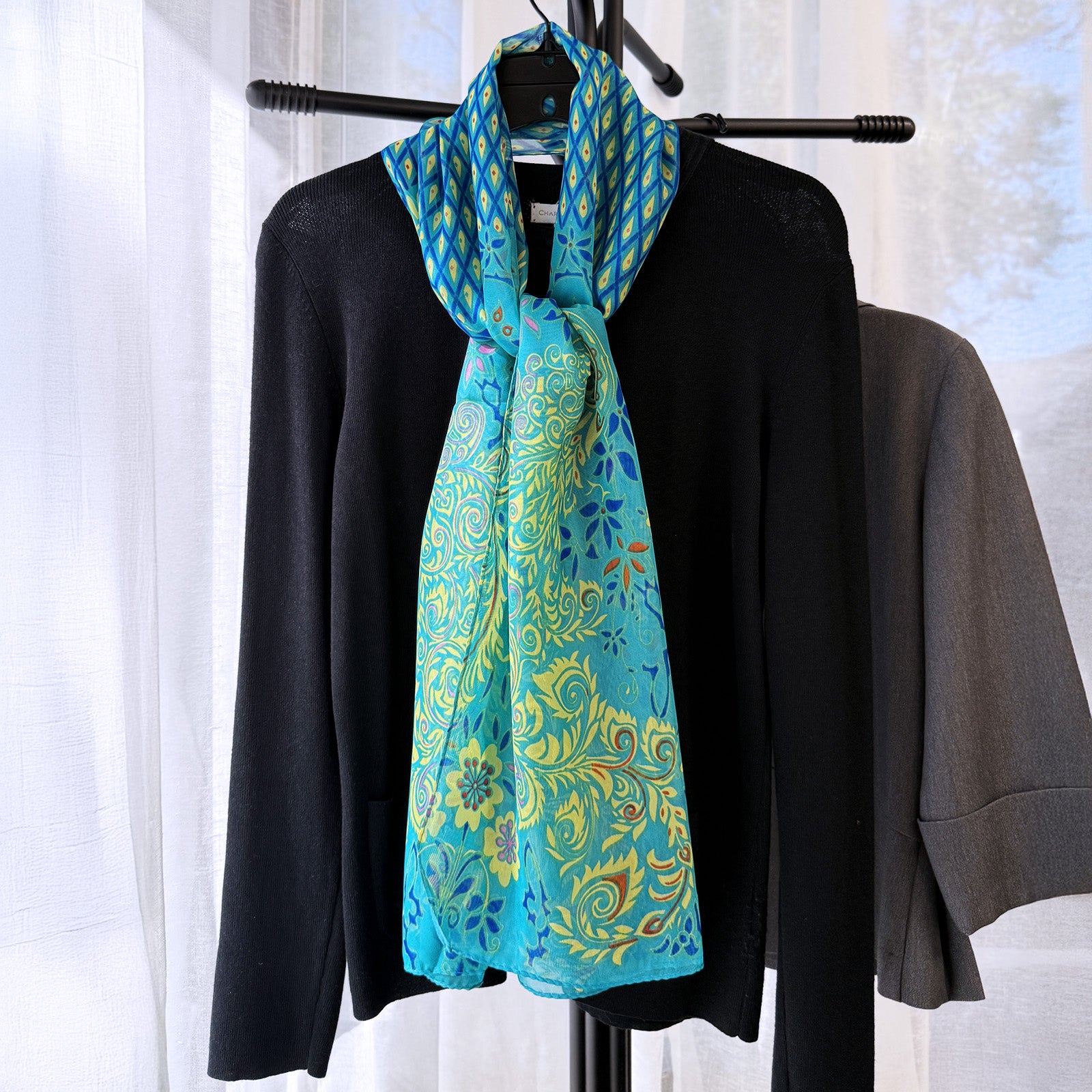 Elevate your wardrobe with our Lightweight Vibrant Spring Chiffon Scarf; a perfect blend of elegance, versatility, and seasonal flair. Crafted from soft, sheer polyester chiffon with a silky-smooth feel, these scarves are designed to keep you comfortable year-round, offering a lightweight yet cozy layer for any weather. Each scarf features eye-catching, colorful patterns that bring a burst of energy to casual and dressy outfits alike. Whether draped around your neck, tied as a headscarf, wrapped around your waist, or styled on your handbag or hat, this accessory adds a touch of personality and effortless charm.