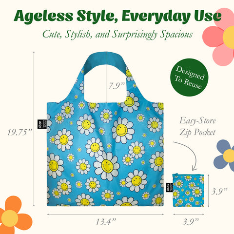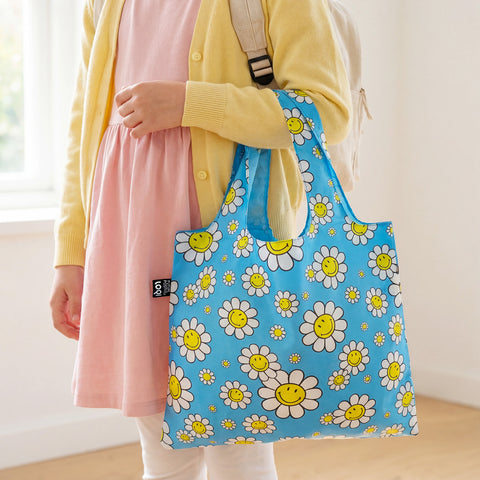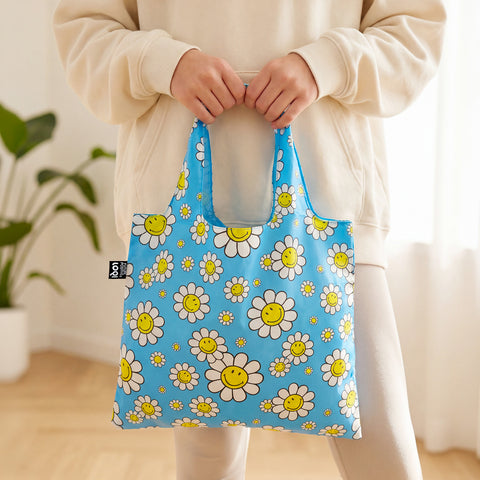 LOQI SMILEY Flowers Recycled Reusable Shopping Bag, Tote Bag Lunch Bag, Book Bag, Small, Aquarius