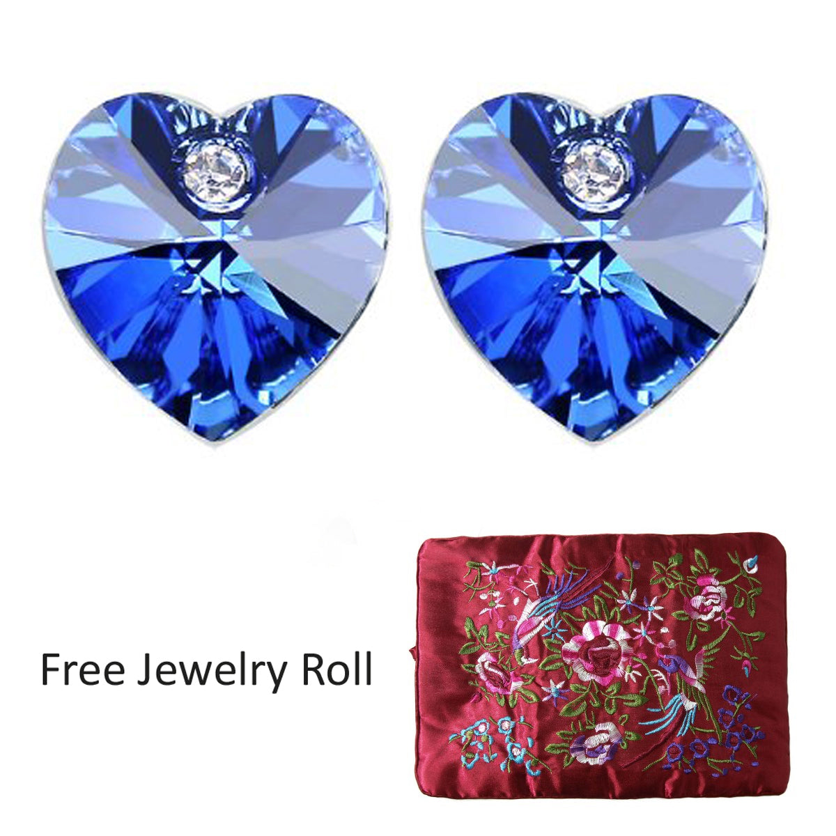 Royal Blue Crystal Heart Gold Plated Stud Earrings + Large Burgundy Silk Embroidered Jewelry Roll