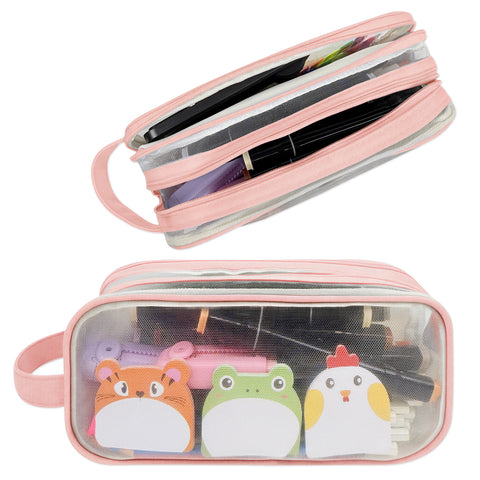 Wrapables 2 Compartment Large Grid Transparent Mesh Pencil Case, Pencil Pouch for Stationery Tools, Makeup, and Travel