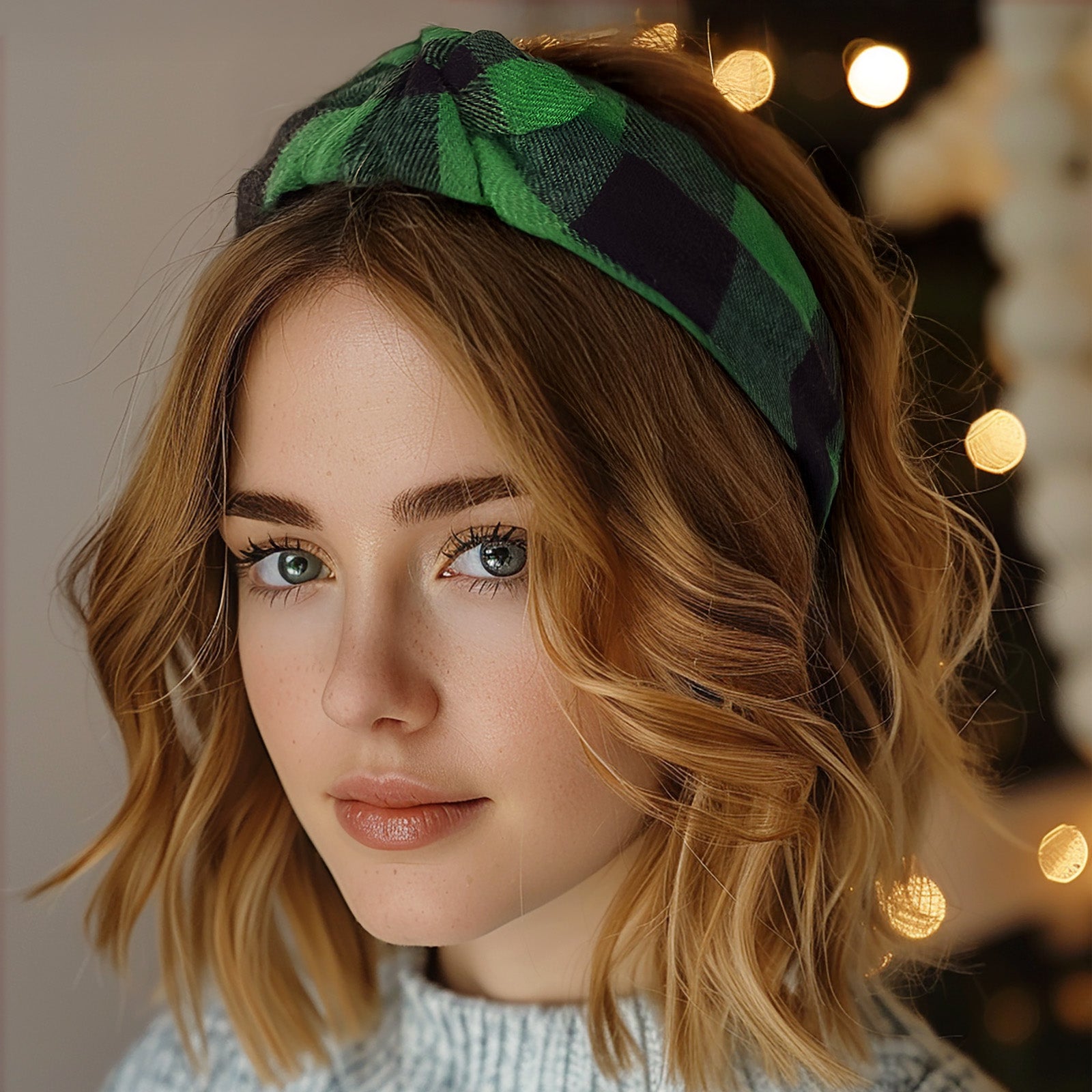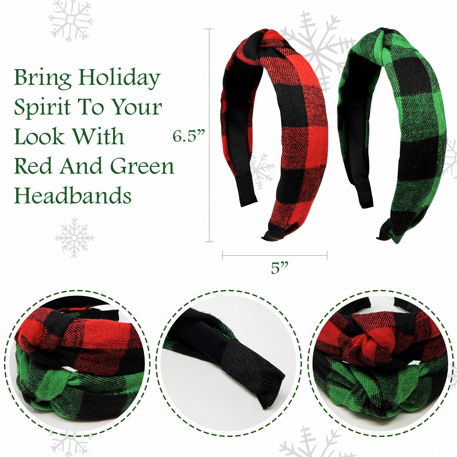 - Set includes 2 wide knotted headbands in festive red and green plaid designs.
